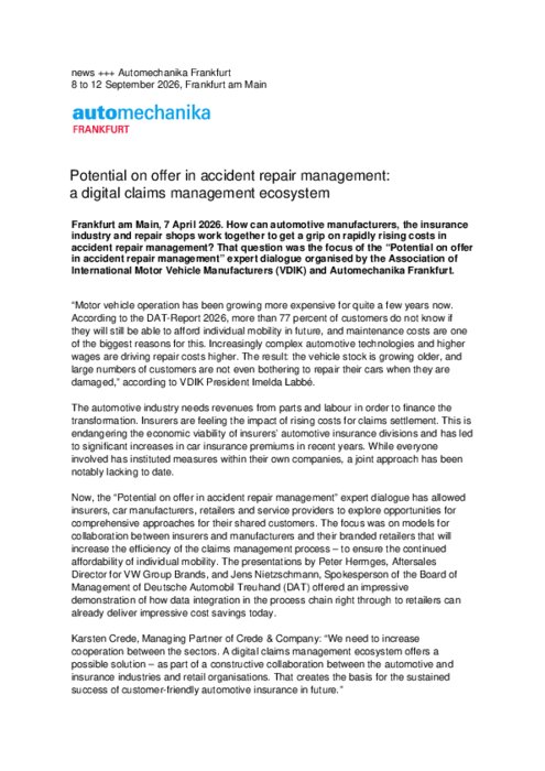 Comment les constructeurs automobiles, le secteur des assurances et les ateliers de réparation peuvent-ils collaborer pour maîtriser la hausse rapide des coûts liés à la gestion des réparations après accident ? Cette question était au cœur du dialogue d'experts intitulé « Le potentiel de la gestion des réparations après accident », organisé par l'Association des constructeurs automobiles internationaux (VDIK) et Automechanika Francfort.