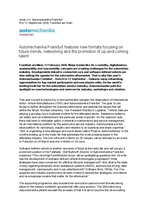 Les grandes tendances telles que l'IA, la mobilité électrique, la numérisation, la durabilité et les nouveaux concepts de mobilité posent des défis à l'industrie automobile. Les développements liés aux voitures connectées et aux véhicules définis par logiciel définissent également l'agenda du marché secondaire de l'automobile. C'est pourquoi le salon Automechanika Frankfurt de cette année, qui se tiendra du 8 au 12 septembre, propose de nombreuses opportunités de réseautage aux principaux acteurs du marché et aux nouveaux venus. En tant que salon leader mondial de l'industrie des services automobiles, Automechanika met l'accent sur les nouvelles technologies et les nouveaux services destinés à l'industrie, aux ateliers et aux détaillants.