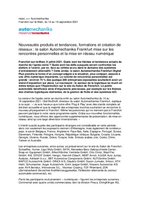 Quels sont les thèmes et tendances actuels du marché de l’après-vente ? Quels sont les défis auxquels seront confrontés les ateliers à l’avenir, par ex. face au rythme accru dans le domaine des systèmes d’entraînement alternatifs ? Cette année, le salon Automechanika Frankfurt Digital Plus prendra la forme d’un concept adapté à la situation, plus compact, associé à une offre numérique importante. La volonté de rencontres personnelles est grande...