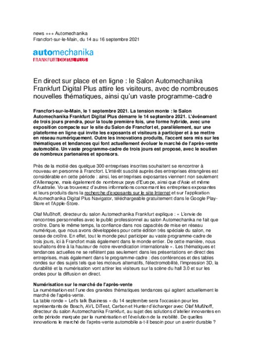 La tension monte : le Salon Automechanika Frankfurt Digital Plus démarre le 14 septembre 2021. L’événement de 3 jours prendra, pour la toute première fois, une forme hybride, avec une exposition compacte sur le site du Salon de Francfort et, parallèlement, sur une plateforme en ligne qui invite les exposants et visiteurs à participer et à se mettre en réseau numériquement. Outre les innovations produits, l'accent sera mis sur les thématiques et tendances qui font actuellement évoluer le marché.