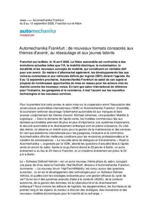 La filière automobile est confrontée à des évolutions actuelles telles que l'IA, la mobilité électrique, la numérisation, la durabilité et les nouveaux concepts de mobilité, qui constituent un véritable défi pour son avenir. En matière d’aftermarket également, les développements liés aux voitures connectées et aux véhicules définis par logiciel (SDV) dictent l'agenda. Du 8 au 12 septembre prochains, Automechanika Frankfurt se saisit de ces sujets et propose de nombreuses opportunités de mise en réseau pour les acteurs clés du marché comme les nouveaux venus. En tant que salon international de référence pour l'industrie, les garagistes et le commerce, il met l'accent sur les nouvelles technologies et les nouveaux services.