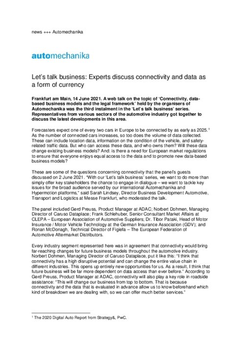 Une présentation Web sur le thème « Connectivité, modèles d’affaires basés sur les données et cadre juridique » organisée par les organisateurs d’Automechanika a été le troisième volet de la série « Parlons affaires ». Des représentants de divers secteurs de l’industrie automobile se sont réunis pour discuter des derniers développements dans ce domaine.