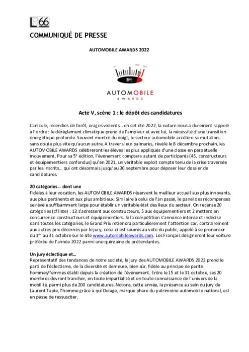 Fidèles à leur vocation, les AUTOMOBILE AWARDS réservent le meilleur accueil aux plus innovants, aux plus pertinents et aux plus ambitieux. Similaire à celui de l’an passé, le panel des récompenses se révèle suffisamment large pour établir un véritable état des lieux du secteur. On recense 20 catégories : 13 s’adressent aux constructeurs, 5 aux équipementiers et 2 mettent en concurrence constructeurs et équipementiers.