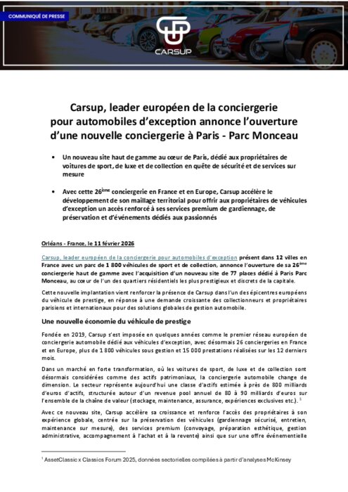 Carsup, leader européen de la conciergerie pour automobiles d’exception,présent dans 12 villes en France avec un parc de 1 800 véhicules de sport et de collection, annonce l’ouverture de sa 26èmeconciergerie haut de gamme en Europe avec l’acquisition d’un nouveau site de 77 places dédié à Paris Parc Monceau, au cœur de l’un des quartiers résidentiels les plus prestigieux et discrets de la capitale.