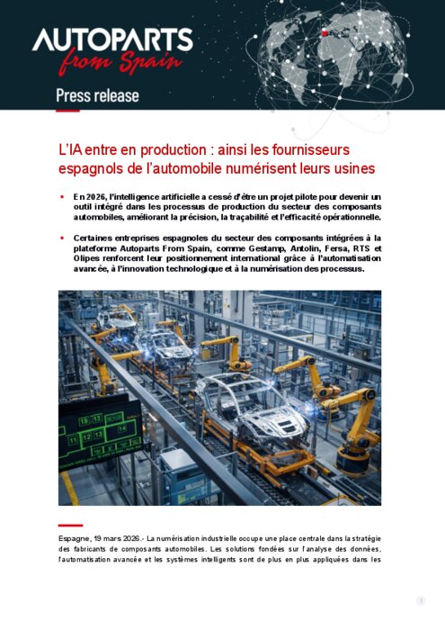 Equipementiers 19 mars 2026 - 13:02 En 2026, l’intelligence artificielle a cessé d’être un projet pilote pour devenir un outil intégré dans les processus de production du secteur des composants automobiles, améliorant la précision, la traçabilité et l’efficacité opérationnelle. PDF (513 Ko) Télécharger credit Autoparts
