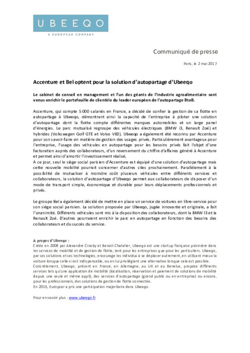 Accenture, qui compte 5 000 salariés en France, a décidé de confier la gestion de sa flotte en autopartage à Ubeeqo, démontrant ainsi la capacité de l'entreprise à piloter une solution d'autopartage dont la flotte compte différentes marques automobiles et un large panel d'énergies.