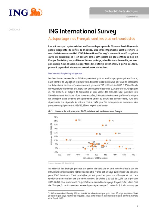 Les voitures partagées existent en France depuis près de 20 ans et font désormais partie intégrante de l’offre de mobilité. Une offre importante semble rendre le marché très concurrentiel. L’ING International Survey a demandé aux Français ce qu’ils en pensaient et il en ressort qu’ils sont parmi les plus enthousiastes en Europe. Toutefois, les problèmes liés au partage, abordés dans l’enquête, ne sont pas encore tous résolus...