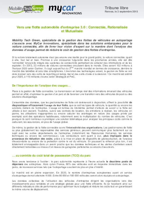 Mobility Tech Green, spécialiste de la gestion des flottes de véhicules en autopartage s’associe avec MyCar Innovations, spécialisée dans les solutions embarquées pour la voiture connectée, afin de livrer leur vision d’expert sur la manière dont l’analyse des données d’usage permet de réduire le coût de gestion des flottes d’entreprise.