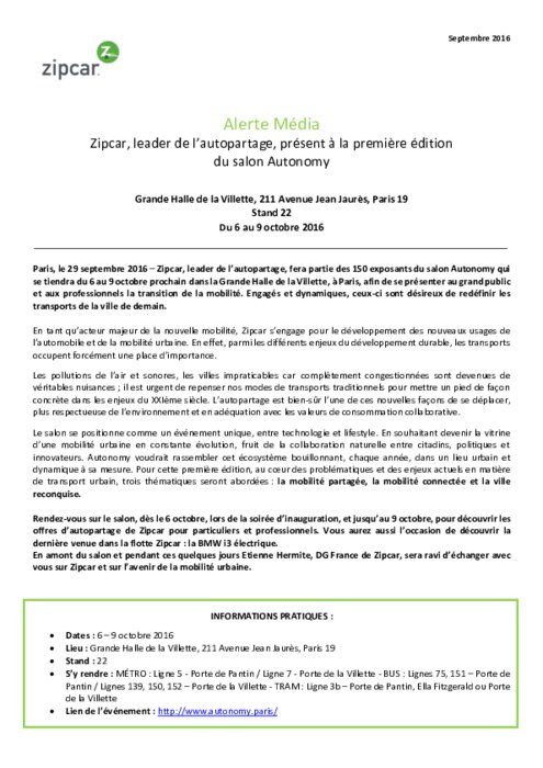 Zipcar, leader de l’autopartage, fera partie des 150 exposants du salon Autonomy qui se tiendra du 6 au 9 octobre prochain dans la Grande Halle de la Villette, à Paris, afin de se présenter au grand public et aux professionnels la transition de la mobilité. Engagés et dynamiques, ceux-ci sont désireux de redéfinir les transports de la ville de demain.