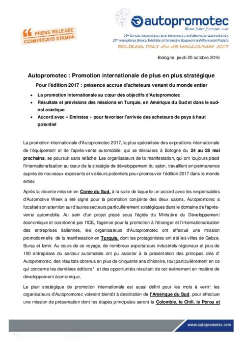 La promotion internationale d'Autopromotec 2017, la plus spécialisée des expositions internationale de l’équipement et de l’après-vente automobile, qui se déroulera à Bologne du 24 au 28 mai prochains, se poursuit sans relâche. Les organisateurs de la manifestation, qui ont toujours placé l'internationalisation au cœur de la stratégie de développement du salon, travaillent en permanence auprès de nouveaux exposants et visiteurs potentiels pour promouvoir l’édition 2017 dans le monde entier.