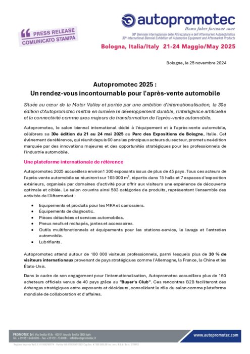 Autopromotec, le salon biennal international dédié à l'équipement et à l'après-vente automobile, célébrera sa 30e édition du 21 au 24 mai 2025 au Parc des Expositions de Bologne, Italie. Cet événement de référence, qui réunit depuis 60 ans les principaux acteurs du secteur, promet une édition marquée par des innovations majeures et des opportunités stratégiques pour les professionnels de l’industrie automobile.