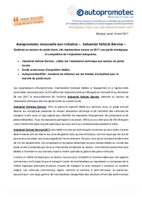 Les organisateurs d’Autopromotec, manifestation biennale dédiée à l’équipement et à l’après-vente automobile, annoncent pour la 27e édition de l’exposition prévue à Bologne du mercredi 24 au dimanche 28 mai 2017 le renouvellement de l’initiative Industrial Vehicle Service, destinée au secteur de l'assistance technique (service après-vente) aux poids lourds.