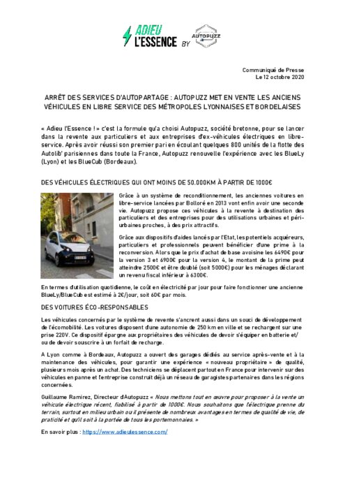 " Adieu l'Essence ! " c'est la formule qu'a choisi Autopuzz, société bretonne, pour se lancer dans la revente aux particuliers et aux entreprises d'ex-véhicules électriques en libre-service. Après avoir réussi son premier pari en écoulant quelques 800 unités de la flotte des Autolib' parisiennes dans toute la France, Autopuzz renouvelle l'expérience avec les BlueLy (Lyon) et les BlueCub (Bordeaux).