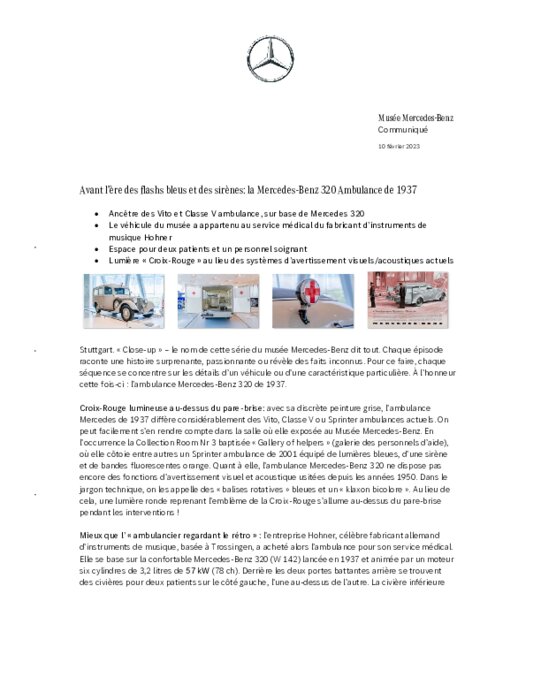 Stuttgart. « Close-up » – le nom de cette série du musée Mercedes-Benz dit tout. Chaque épisode raconte une histoire surprenante, passionnante ou révèle des faits inconnus. Pour ce faire, chaque séquence se concentre sur les détails d’un véhicule ou d’une caractéristique particulière. À l’honneur cette fois-ci : l’ambulance Mercedes-Benz 320 de 1937.