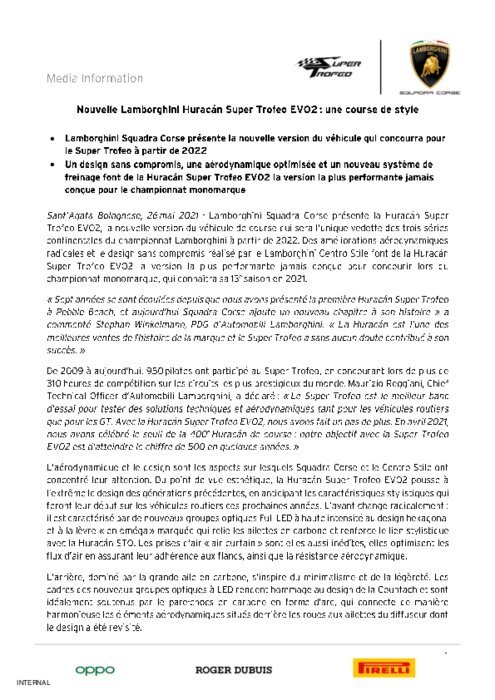 Lamborghini Squadra Corse présente la Huracân Super Trofeo EV02, la nouvelle version du véhicule de course qui sera l'unique vedette des trois séries continentales du championnat Lamborghini à partir de 2022. Des améliorations aérodynamiques radicales et le design sans compromis réalisé par le Lamborghini Centro Stile font de la Huracân Super Trofeo EV02 la version la plus performante jamais conçue pour concourir lors du championnat monomarque, qui connaîtra sa 13e saison en 2021.