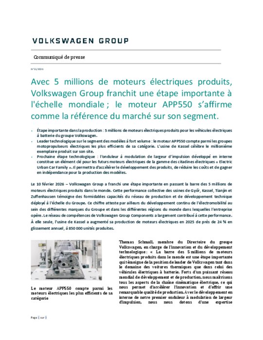 Volkswagen Group a franchi une étape importante en passant la barre des 5 millions de moteurs électriques produits dans le monde. Cette performance collective des usines de Győr, Kassel, Tianjin et Zuffenhausen témoigne des formidables capacités du réseau de production et de développement technique déployé à l'échelle du Groupe. Ce chiffre atteste par ailleurs du développement continu de l’électromobilité au sein des différentes marques du Groupe et dans les différentes régions du monde dans lesquelles l’entreprise opère. Le réseau de compétences de Volkswagen Group Components a largement contribué à cette performance. À elle seule, l'usine de Kassel a augmenté sa production de moteurs électriques en 2025 de près de 24 % en glissement annuel, à 850 000 unités produites.