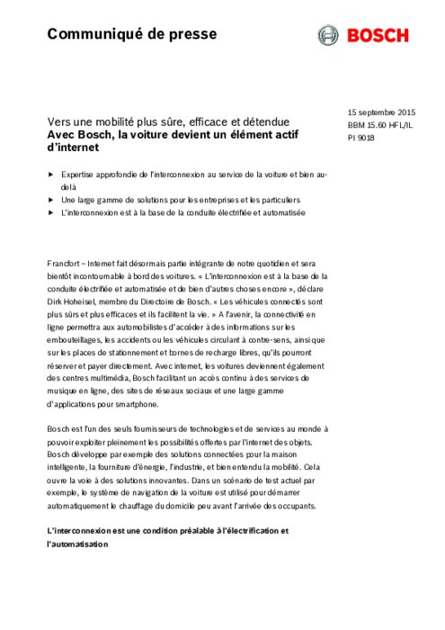 Internet fait désormais partie intégrante de notre quotidien et sera bientôt incontournable à bord des voitures. « L’interconnexion est à la base de la conduite électrifiée et automatisée et de bien d’autres choses encore », déclare Dirk Hoheisel, membre du Directoire de Bosch. « Les véhicules connectés sont plus sûrs et plus efficaces et ils facilitent la vie. » A l’avenir, la connectivité en ligne permettra aux automobilistes d’accéder à des informations sur les embouteillages...