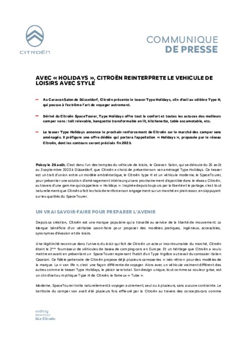 C’est dans l’un des temples du véhicule de loisirs, le Caravan Salon, qui se déroule du 25 août au 3 septembre 2023 à Düsseldorf, que Citroën a choisi de présenter son van aménagé Type Holidays. Ce teaser est un trait d’union entre un modèle emblématique, le Citroën type H et un véhicule moderne, le SpaceTourer, pour présenter une solution d’aménagement intérieur qui sera prochainement disponible dans le réseau Citroën, au travers d’une gamme qui s’appellera « Holidays ». Inspirée depuis toujours par la liberté et le partage, c’est tout naturellement que Citroën a fait le choix de renforcer son engagement sur un marché en plein essor, en s’appuyant sur les qualités du SpaceTourer.