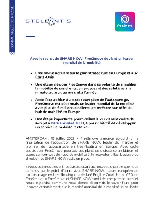 Free2move annonce aujourd’hui la finalisation de l’acquisition de SHARE NOW, leader du marché et pionnier de l’autopartage en free-floating en Europe. Avec cette acquisition, Free2move poursuit ses plans de croissance ambitieux et étend son concept de hubs de mobilité à 14 nouvelles villes. L’équipe de direction de SHARE NOW reste en place.