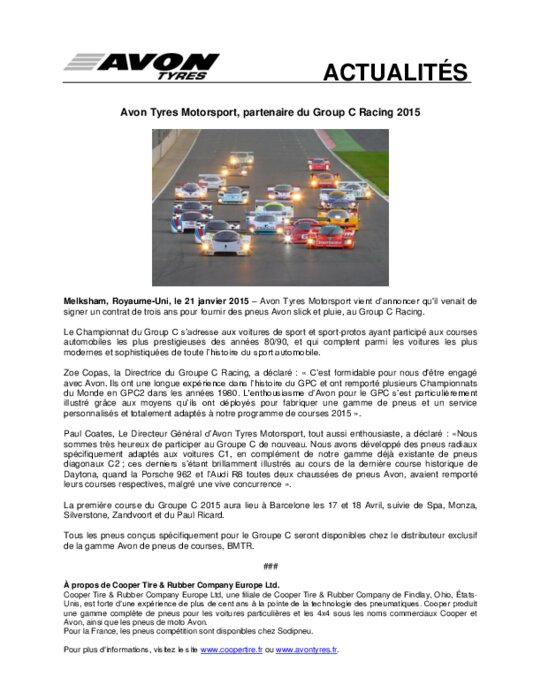Equipementiers 21 janvier 2015 - 17:28 Avon Tyres Motorsport vient d’annoncer qu'il venait de signer un contrat de trois ans pour fournir des pneus Avon slick et pluie, au Group C Racing. PDF (233 Ko) Télécharger