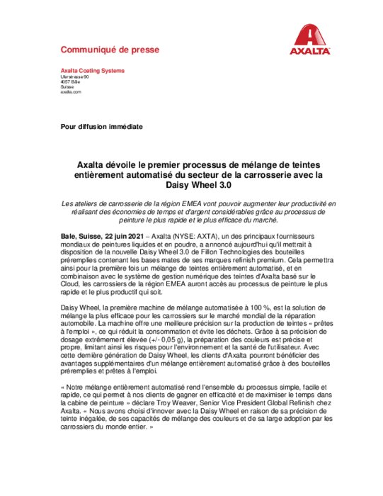 Axalta un des principaux fournisseurs mondiaux de peintures liquides et en poudre, a annoncé qu'il mettrait à disposition de la nouvelle Daisy Wheel 3.0 de Fillon Technologies des bouteilles pré-remplies contenant les bases mates de ses marques refinish premium. Cela permettra ainsi pour la première fois un mélange de teintes entièrement automatisé, et en combinaison avec le système de gestion numérique des teintes d'Axalta basé sur le Cloud...