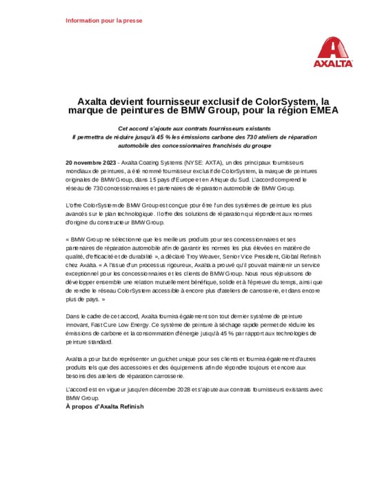 Axalta devient fournisseur exclusif de ColorSystem, la marque de peintures de BMW Group