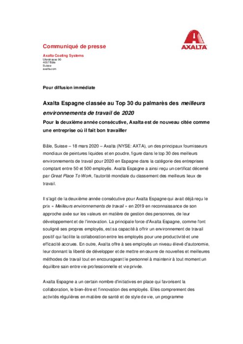 Axalta, un des principaux fournisseurs mondiaux de peintures liquides et en poudre, figure dans le top 30 des meilleurs environnements de travail pour 2020 en Espagne dans la catégorie des entreprises comptant entre 50 et 500 employés. Axalta Espagne a ainsi reçu un certificat décerné par Great Place To Work, l'autorité mondiale du classement des meilleurs lieux de travail.