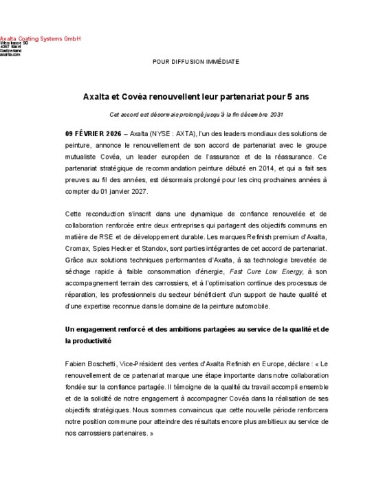 Axalta (NYSE : AXTA), l’un des leaders mondiaux des solutions de peinture, annonce le renouvellement de son accord de partenariat avec le groupe mutualiste Covéa, un leader européen de l’assurance et de la réassurance. Ce partenariat stratégique de recommandation peinture débuté en 2014, et qui a fait ses preuves au fil des années, est désormais prolongé pour les cinq prochaines années à compter du 01 janvier 2027.