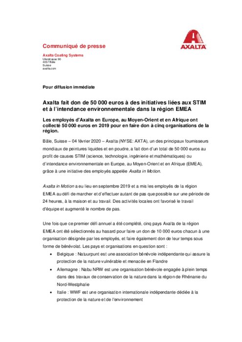 Axalta, un des principaux fournisseurs mondiaux de peintures liquides et en poudre, a fait don d’un total de 50 000 euros au profit de causes STIM (science, technologie, ingénierie et mathématiques) ou d’intendance environnementale en Europe, au Moyen-Orient et en Afrique (EMEA), grâce à une initiative des employés appelée Axalta in Motion.