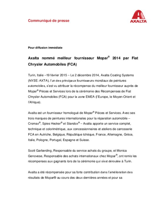 Le 2 décembre 2014, Axalta Coating Systems, l’un des principaux fournisseurs mondiaux de peintures automobiles, s’est vu attribuer la récompense du meilleur fournisseur auprès de Mopar® Pièces et Services lors de la cérémonie des Récompenses de Fiat Chrysler Automobiles (FCA) pour la zone EMEA (l’Europe, le Moyen-Orient et
