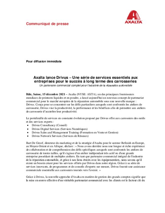 Axalta, un des principaux fournisseurs mondiaux de peintures liquides et en poudre, a lancé un nouveau concept de partenariat commercial pour le marché européen de la réparation automobile sous une nouvelle marque : Drivus. Conçu pour se concentrer sur les défis particuliers auxquels sont confrontés les ateliers de carrosserie, Drivus vise la productivité, la performance et les bénéfices afin de permettre aux ateliers de carrosserie d’accroître leur productivité.