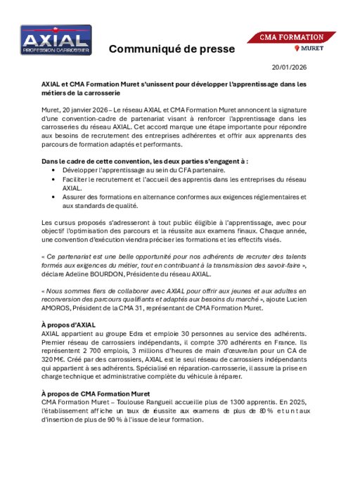 Le réseau AXIAL et CMA Formation Muret annoncent la signature d’une convention-cadre de partenariat visant à renforcer l’apprentissage dans les carrosseries du réseau AXIAL. Cet accord marque une étape importante pour répondre aux besoins de recrutement des entreprises adhérentes et offrir aux apprenants des parcours de formation adaptés et performants.