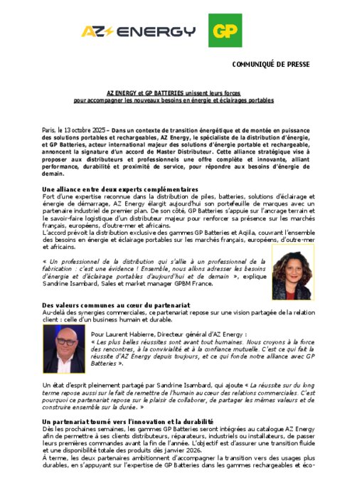 Dans un contexte de transition énergétique et de montée en puissance des solutions portables et rechargeables, AZ Energy, le spécialiste de la distribution d’énergie, et GP Batteries, acteur international majeur des solutions d’énergie portable et rechargeable, annoncent la signature d’un accord de Master Distributeur. Cette alliance stratégique vise à proposer aux distributeurs et professionnels une offre complète et innovante, alliant performance, durabilité et proximité de service, pour répondre aux besoins d’énergie de demain.