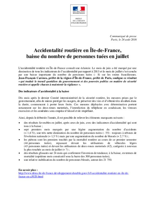 Baisse de l’accidentalité routière en IDF en juillet
