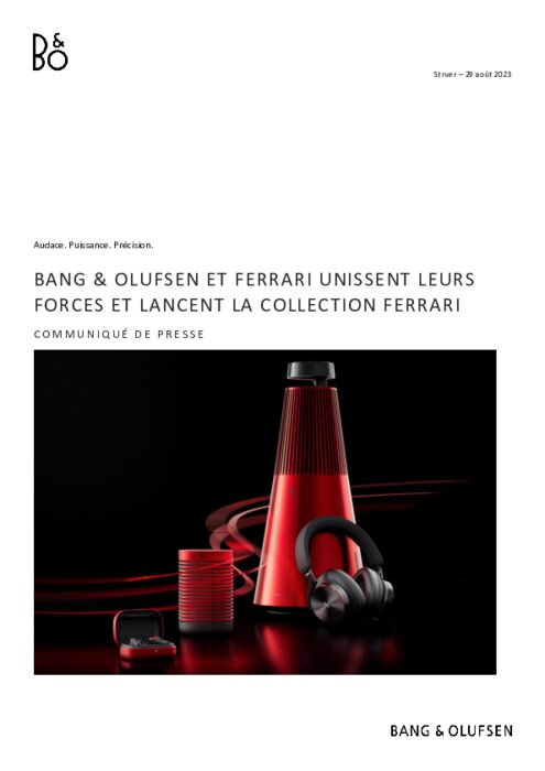 Bang & Olufsen lance aujourd’hui une nouvelle collection en collaboration avec les pionniers du sport automobile Ferrari. Cette collection met en valeur l’excellence de Bang & Olufsen dans le travail de l’aluminium, et célèbre la passion commune des deux marques pour l’audace, la puissance et la précision. Ensemble, B&O et Ferrari ont réinventé une série de casques et d’enceintes : l’enceinte domestique Beosound 2, le casque Beoplay H95, les écouteurs Beoplay EX et l’enceinte portable Beosound Explore. Toute la gamme est unie par une teinte rouge frappante, qui crée une association immédiate et évidente avec la signature de la marque Ferrari.