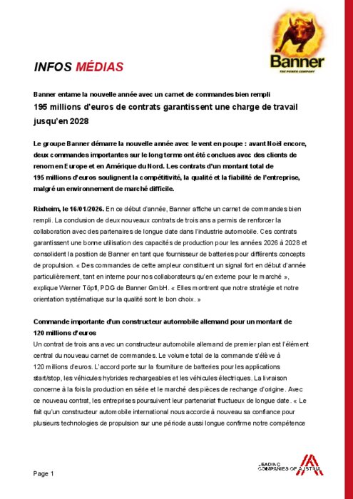 Le groupe Banner démarre la nouvelle année avec le vent en poupe : avant Noël encore, deux commandes importantes sur le long terme ont été conclues avec des clients de renom en Europe et en Amérique du Nord. Les contrats d’un montant total de 195 millions d’euros soulignent la compétitivité, la qualité et la fiabilité de l’entreprise, malgré un environnement de marché difficile.
