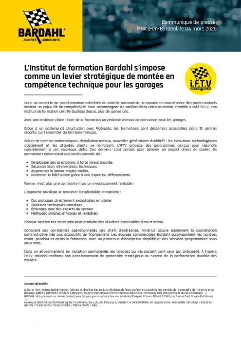 Dans un contexte de transformation accélérée du marché automobile, la montée en compétence des professionnels devient un enjeu clé de compétitivité. Pour accompagner les ateliers dans cette mutation, Bardahl a créé l’IFTV, son institut de formation certifié Qualiopi depuis plus de quinze ans.