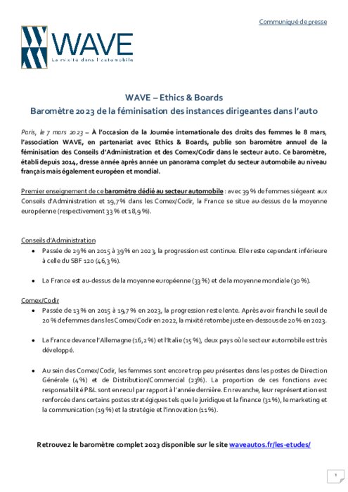À l’occasion de la Journée internationale des droits des femmes le 8 mars, l’association WAVE, en partenariat avec Ethics & Boards, publie son baromètre annuel de la féminisation des Conseils d’Administration et des Comex/Codir dans le secteur auto. Ce baromètre, établi depuis 2014, dresse année après année un panorama complet du secteur automobile au niveau français mais également européen et mondial.