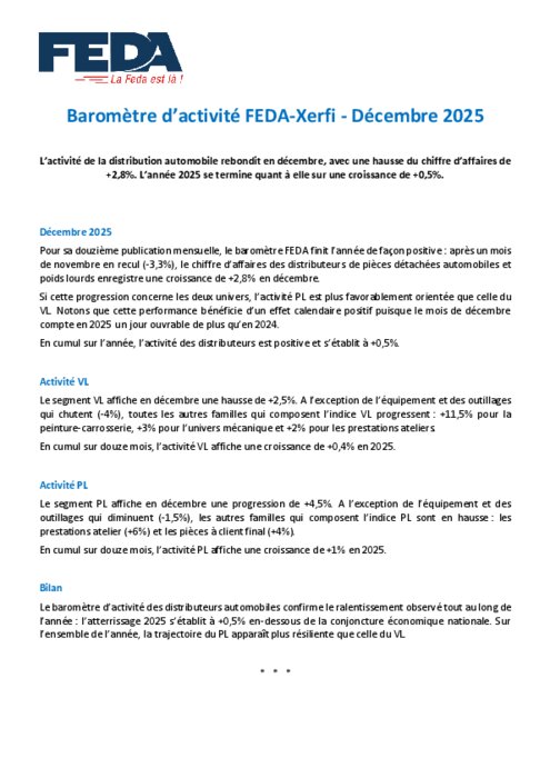 Pour sa douzième publication mensuelle, le baromètre FEDA finit l’année de façon positive : après un mois de novembre en recul (-3,3%), le chiffre d’affaires des distributeurs de pièces détachées automobiles et poids lourds enregistre une croissance de +2,8% en décembre.