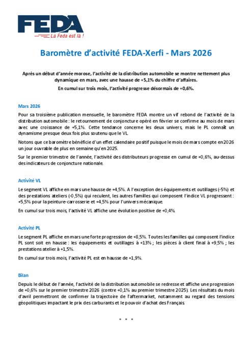 Distributeurs 28 avril 2026 - 09:24 Après un début d’année morose, l’activité de la distribution automobile se montre nettement plus dynamique en mars, avec une hausse de +5,1% du chiffre d’affaires. En cumul sur trois mois, l’activité progresse désormais de +0,6%. PDF (483 Ko) Télécharger