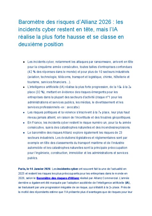 Les incidents cyber, notamment les attaques par ransomware, arrivent en tête pour la cinquième année consécutive, toutes tailles d’entreprises confondues (42 % des réponses dans le monde) et pour plus de 10 secteurs industriels (aviation, technologie, télécoms, transport et logistique, chimie, hôtellerie et tourisme, services financiers…).