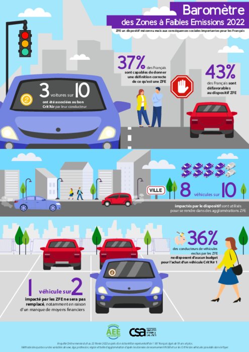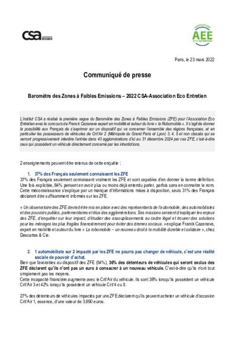 L’institut CSA a réalisé la première vague du Baromètre des Zones à Faibles Emissions (ZFE) pour l’Association Eco Entretien avec le concours de Franck Cazenave expert en mobilité et auteur du livre « la Robomobile ». Il s’agit de donner la possibilité aux Français de s’exprimer sur un dispositif qui va concerner l’ensemble des régions françaises, et en particulier les possesseurs de véhicules de Crit’Air 2 (Métropole du Grand Paris et Lyon) 3, 4, 5...