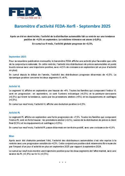 Pour sa neuvième publication mensuelle, le baromètre FEDA affiche une activité plus favorable que celle de la conjoncture nationale. En cette rentrée, l’activité des distributeurs de pièces automobiles et poids lourds renoue avec une trajectoire positive, avec +4,5% de croissance en septembre (et un jour d’activité en plus). En cumul depuis le début de l’année, l’activité des distributeurs progresse désormais de +0,5%. La dynamique positive concerne les deux segments VL et PL.