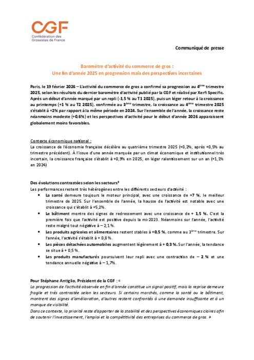 Baromètre du commerce de gros : une fin 2025 en progression mais des perspectives incertaines