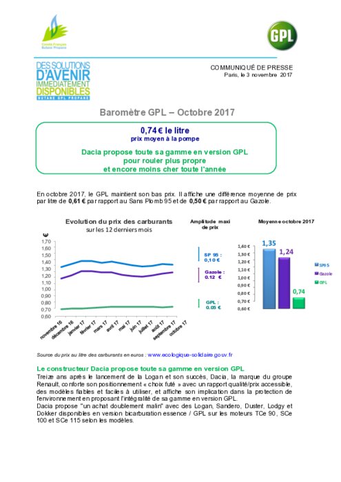 Services 03 novembre 2017 - 11:27 En octobre 2017, le GPL maintient son bas prix. Il affiche une différence moyenne de prix par litre de 0,61 € par rapport au Sans Plomb 95 et de 0,50 € par rapport au Gazole. PDF (2 Mo) Télécharger