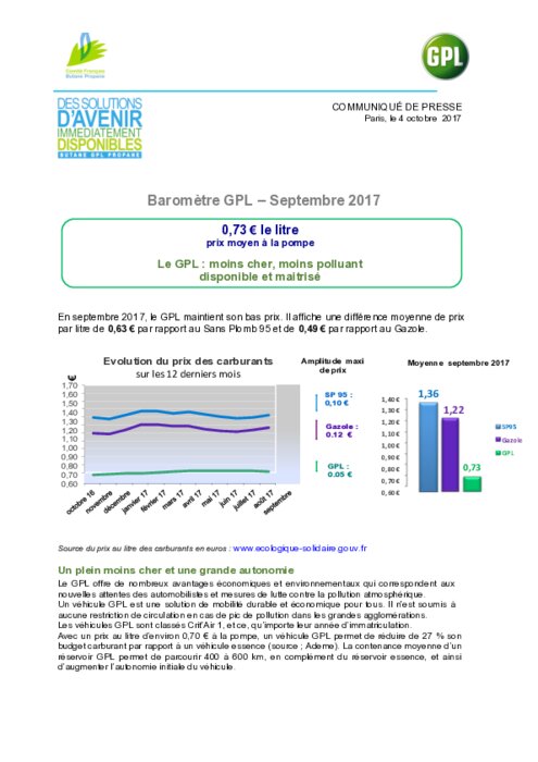 En septembre 2017, le GPL maintient son bas prix. Il affiche une différence moyenne de prix par litre de 0,63 € par rapport au Sans Plomb 95 et de 0,49 € par rapport au Gazole.