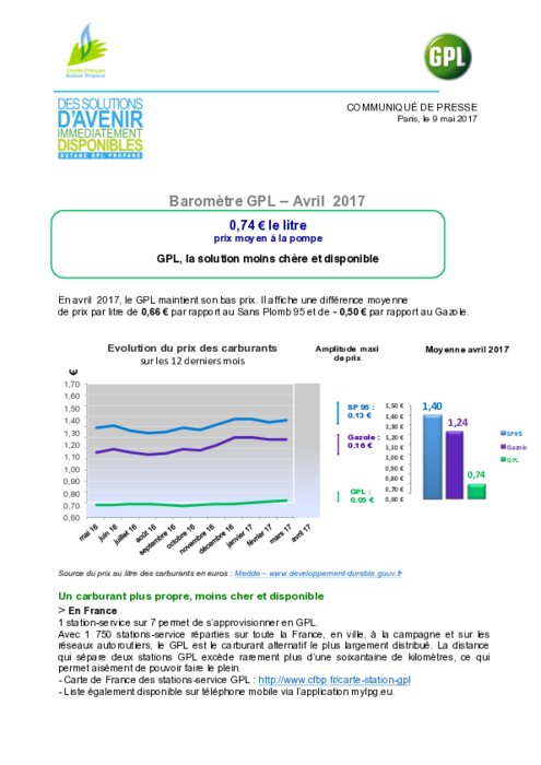 Services 09 mai 2017 - 11:42 En avril 2017, le GPL maintient son bas prix. Il affiche une différence moyenne de prix par litre de 0,66 € par rapport au Sans Plomb 95 et de - 0,50 € par rapport au Gazole. PDF (1 Mo) Télécharger