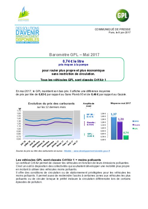 Services 08 juin 2017 - 10:46 En mai 2017, le GPL maintient son bas prix. Il affiche une différence moyenne de prix par litre de 0,63 € par rapport au Sans Plomb 95 et de 0,46 € par rapport au Gazole. PDF (1 Mo) Télécharger