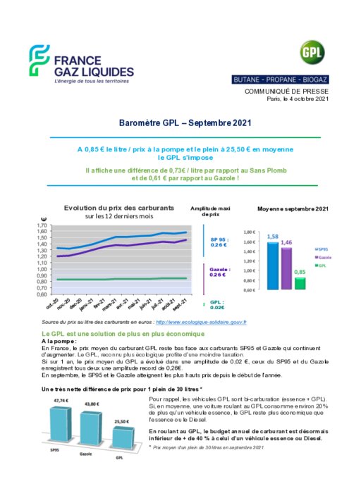 Services 04 octobre 2021 - 15:28 A 0,85 € le litre / prix à la pompe et le plein à 25,50 € en moyenne le GPL s'impose. Il affiche une différence de 0,73€ / litre par rapport au Sans Plomb et de 0,61 € par rapport au Gazole. PDF (454 Ko) Télécharger