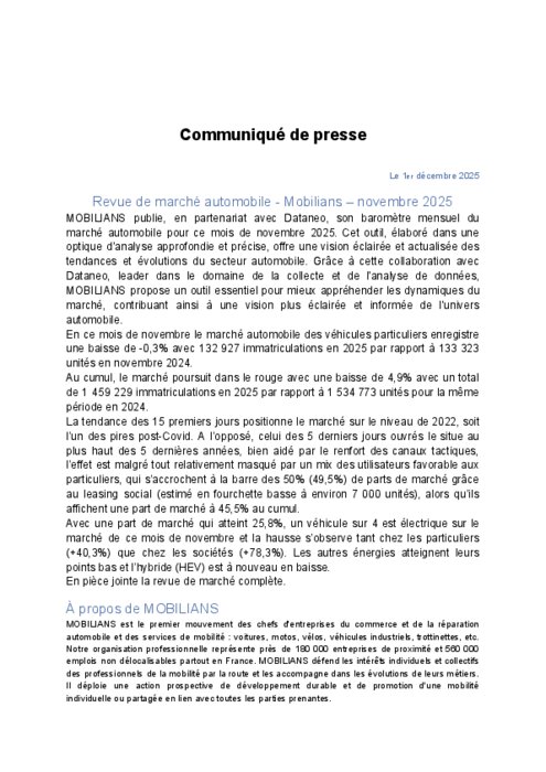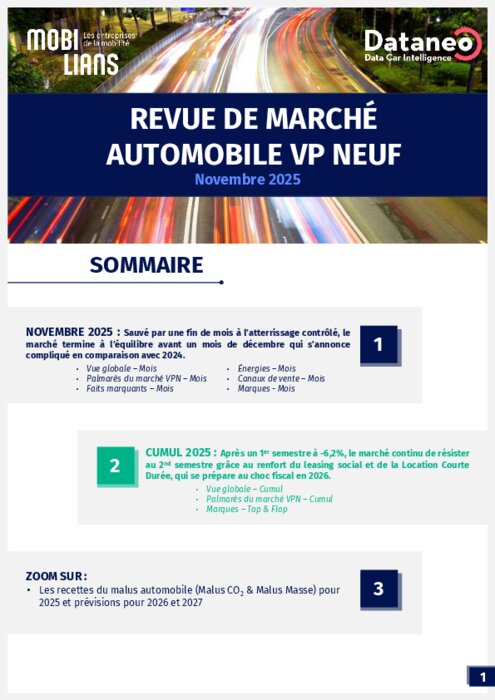 En partenariat avec Dataneo, MOBILIANS publie son baromètre mensuel du marché automobile pour ce mois de novembre 2025. Cet outil, élaboré dans une optique d'analyse approfondie et précise, offre une vision éclairée et actualisée des tendances et évolutions du secteur automobile. Grâce à cette collaboration avec Dataneo, leader dans le domaine de la collecte et de l'analyse de données, MOBILIANS propose un outil essentiel pour mieux appréhender les dynamiques du marché, contribuant ainsi à une vision plus éclairée et informée de l'univers automobile.